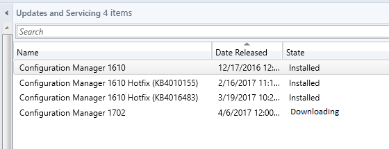 For unknown reason(s) when attempting to update Configuration Manager from 1610 to 1702, our downloading State was stuck. We were able to update from previous versions no problem, but 1702 would not kick over from “Downloading” to “Available”.