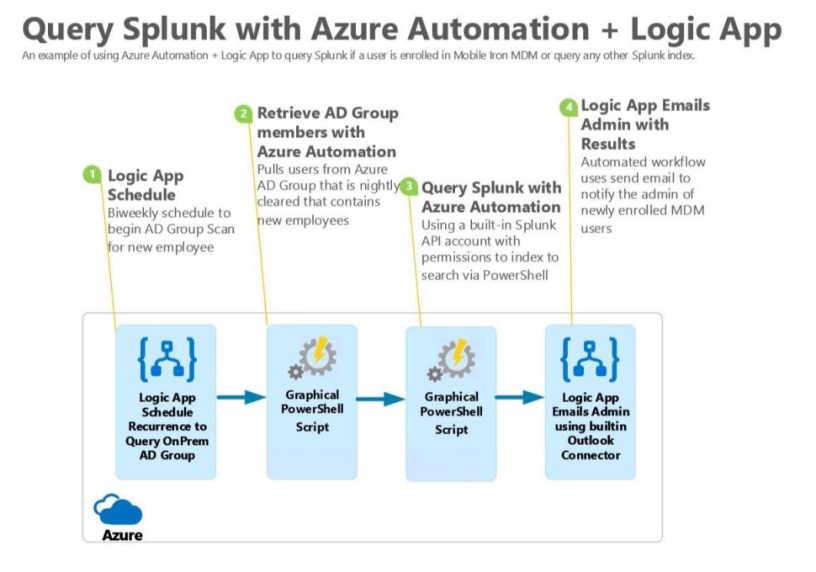 Using Azure Automation, Logic App, and an O365 mailbox you can create a workflow that notifies your admin when a new user is enrolled in MDM using a Splunk index. In this example I created a notification that notifies the Admin when Mobile Iron “actionType=INSTALL_MDM_PROFILE” occurs. This Splunk query pulls the action unique to what I am trying to alert on, but can be modified to any Splunk search.