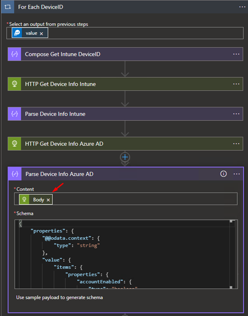 Azure AD device information will be required in future steps, so we will need to parse the results from “HTTP Get Device Info Azure AD”. Use the below sample or generate schema from running the Logic App now.