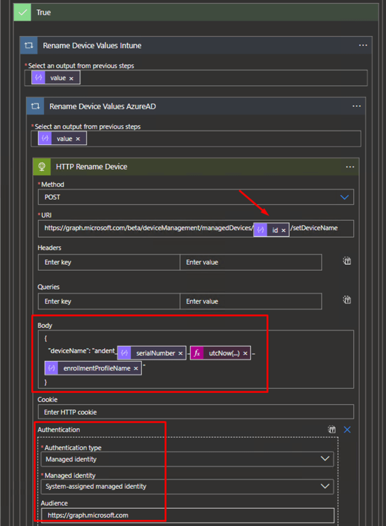 Id in the URI comes from the value from Action 7- “Parse Device Infor Azure AD”